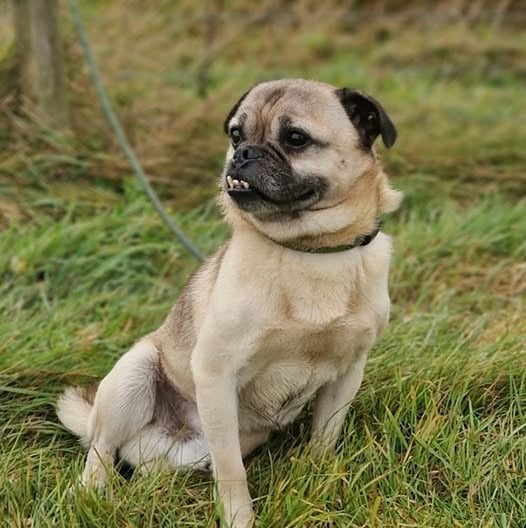 Hello I 'm Piggy the pug ! I m about 4-5 years old A cheeky chap with a special smile I love to sit on your knee and have a fuss amost as much as going for walks.I'm neutered and have had a few teeth removed so now I 'm ready for my forever home. I m a bit bigger than your avarage pug so there might be a bit of something else in me but naturewise I m a fun loving typical pug I ve got on well with all the dogs here and I 'm happy to travel in the car. I have no experience of children so would like an adult home please :)